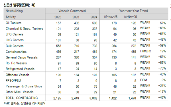 46주차 오일탱커 14척, 케미컬 및 특수선 2척, LPG선 1척, 드라이벌크선 8척, 컨테이너선 11척, 제너럴카고선 11척, 해양지원선 2척, 여객선 및 크루즈 6척, 기타선 1척 등 총 56척을 기록했다. 46주차 누적수주량은 1,478척이고, 전년동기 누적 수주량은 총 2,029척이었다.