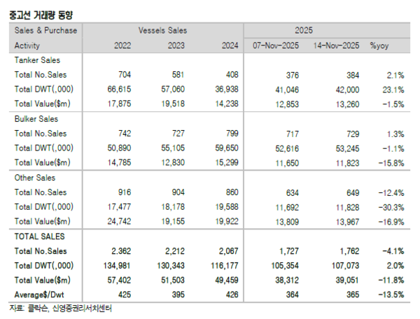 선종별 상세선가는 주요 선종 모두 변동이 없었다. 46주차 중고선박은 총 35척이 거래됐다. 누적기준 거래량은 1,762척이며, 전년동기 누적 래량은 1,837척이었다.
