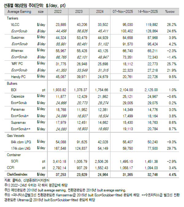 한편 중동-중국 간 원유수송선 운임 강세로 탱커 운임이 초강세다.