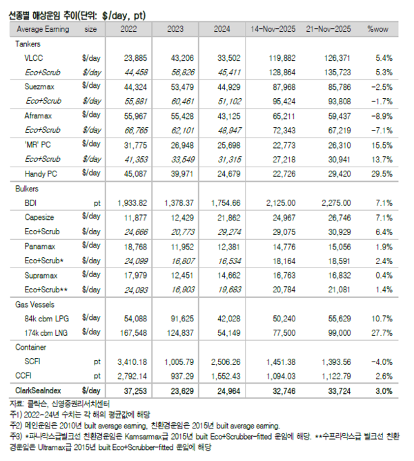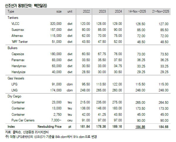 지난 주는 가스선과 VLCC 운임이 초강세였다. 신조선가지수와 중고선가지수 모두 하락했다. 24일 신영증권 엄경아 애널리스트에 따르면 47주차(11월 21일) 신조선가지수는 전주 대비 0.18포인트 하락한 184.68p를 기록했다. 선종별 상세선가를 보면 탱커 중 VLCC가 50만 달러 상승했고 수에즈막스급도 50만 달러 올랐다. 가스선 중 91k(9만1000) cbm급 LPG선이 50만 달러 하락했다. 컨테이너선 중 2만3,000TEU급은 50만 달러 하락했고 1만3,000TEU급은 75만 달러 내렸다.
