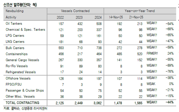 47주차 오일탱커는 21척, 케미컬 및 특수선 2척, LNG선 2척, 드라이벌크선 6척, 컨테이너선 35척, 제너럴카고선 11척, 해양지원선 7척, 여객선 및 크루즈 3척으로 등 총 87척을 기록했다. 47주차 누적수주량은 1,565척이고, 전년동기 누적 수주량은 총 2,090척이었다.