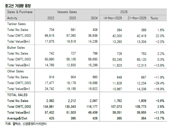 선종별 상세선가는 모두 변동이 없었다. 47주차 중고선박은 총 47척이 거래됐다. 누적기준 거래량은 1,809척이며, 전년동기 누적 래량은 1,877척이었다.