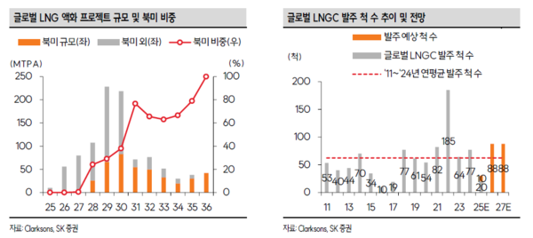 지난 11월 17일 HD현대삼호중공업이 수주한 LNGC 2척의 발주처는 BW LNG인것으로 파악되며, 해당 선주는 장기 용선 계약 확보 없이 해당 물량을 투기적으로 발주한 것으로 알려졌다. 이는 글로벌 LNGC 신조선가가 다시 상승세로 전환될 가능성이 높다고 판단했거나 내년부터 북미 LNG 프로젝트에 필 요한 LNGC 대규모 발주를 앞두고 상대적 단납기 슬롯을 노린 것으로 추정된다. 국내 조선 3사의 ‘28년 하반기 슬롯이 채워진 이후부터 ‘29~’30년 LNG 생산 스케 줄에 필요한 신조 슬롯을 확보하기 위한 글로벌 선주들의 경쟁 발주가 치열해질 전망이다.