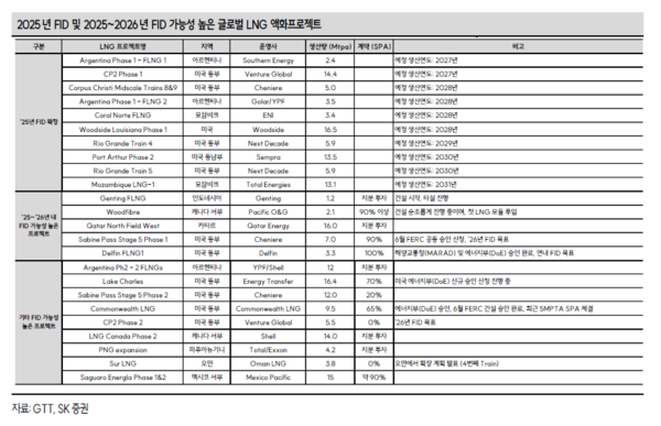 올해 글로벌 LNG 액화 프로젝트 중 FID(최종투자결정) 규모는 총 84Mtpa이며, 이 중 61Mtpa 가 미국이다. GTT에 따르면 올해 FID가 확정된 글로벌 LNG 프로 젝트에 약 150척의 LNGC가 필요할 전망이다. 67Mtpa는 미주에서 나와 나머지 국가로 가는 물량으로 보고 있고, 해당 항로의 운송 집약도는 1Mtpa 당 약 2척의 LNGC가 필요할 것으로 추정되기 때문에 134척의 LNGC 가 필요하다. 나머지 17Mtpa는 모잠비크 등 타 지역에서 운송되는 것으로, 해당 항로의 운송 집약도는 1Mtpa 당 약 1척의 LNGC가 필요하다. 올해 남은 기간 어느 정도의 신조 발주가 이어질 예정이며, 2026년은 LNGC 발주 규모 측면에서 상당한 물량이 쏟아져 나올 것으로 전망한다.
