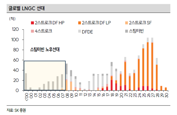 현재 글로벌 운항중인 LNGC 선대는 총 860척이며, 이 중에서도 탄소배출량이 많고, 운항 효율성이 낮은 스팀터빈 선대들이 총 213 척으로 현재 선대 중 24.7% 를 차지한다. 이들 모두 점진적으로 폐선될 잠재적 교체 수요이며, 최근 단기적으로 낮은 LNGC 운임은 해당 수요를 더욱 확대시켜 향후 신조 발주 트리거로 이어질 것을 예상하고 있다.