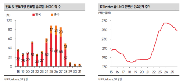 2026년 조선업 상선의 펀더멘털은 견고할 전망이다. 24일 SK증권 한승한 애널리스트에 따르면 국내 조선업의 상선 펀더멘털은 견고할 전망이다. 1)LNGC: 내년부터 북미 LNG 프로젝트에 필요한 LNG 운반선 대규모 발주가 예상되며, 2)컨테이너선: 탑티어 라 이너들의 인프라 투자 개념 및 선대 확장 경쟁을 위한 수요와 중하위 티어 라이너들 의 친환경 선대 교체 수요는 지속되며 올해 대비 소폭 감소한 발주세 나타날 전망이다. 또한 3)탱커: 노후선대 교체 수요, EU의 러시아 그림자 함대 제재 확대, OPEC+ 의 증산 재개 등에 따른 운임 상승과 이에 따른 신조 발주 확대가 본격적으로 시작될 것으로 예상하고 있다.