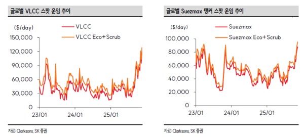 VLCC 스팟 운임이 최근 $10 만/day 수준을 넘기면서 올해 연초 대비 약 3배 이상 상승했다. 지난 10월 23일 유럽연합(EU)이 러시아 그림자 함대(Shadow Fleet) 중 117척을 추가 제재 대상으로 지정하면서 총 557척으로 확대됐고, 이에 따른 가용 선대 감소한 영향이 큰 것으로 추정된다. 이에 더해 최근 OPEC+의 증산 재개 에 따른 영향까지 더해지고 있다.