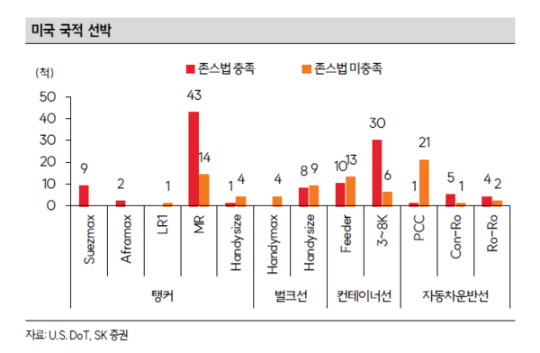 전략상선단을 제외하면 일반 미국 상선은 존스법(Jones Act)이 폐지되거나 이에 대 치되는 법안인 ‘미국 수역 개방 법안(Open America’s Waters Act)’이 미 의회에 서 통과되지 않는 이상, 미국 내 조선소에서 건조될 수밖에 없으며, 이는 이미 미국 존스법 적용 MR 탱커를 수주한 한화필리조선소 중심으로 진행될 가능성이 높다.