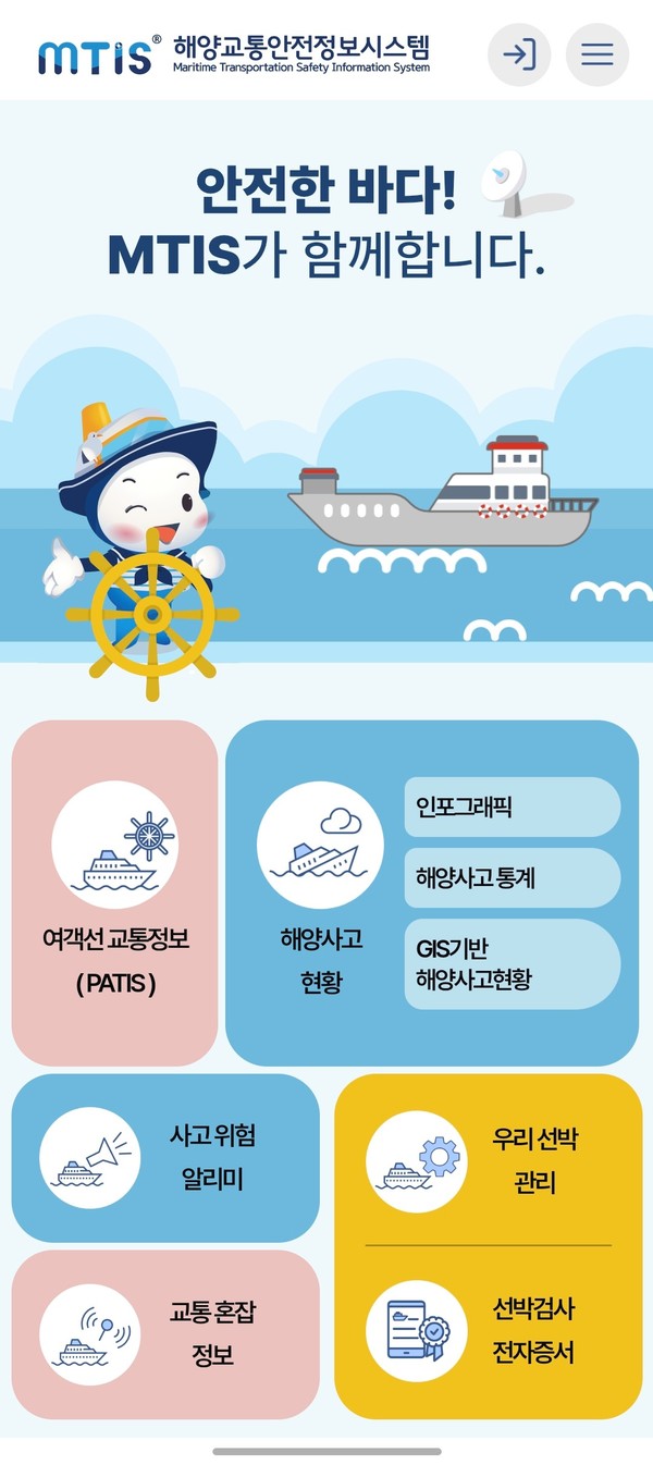 * (주요기능) 우리 선박(선사) 관리, 지리정보시스템(GIS) 기반 해양사고 정보, 사고위험 알리미, 해상교통혼잡정보, 여객선 교통정보(PATIS) 등